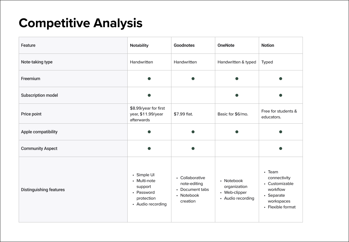 We looked at the top-ranked note-taking apps and softwares on Android and Apple app stores, and conducted a competitor analysis of Notability, Goodnotes, OneNote and Notion.