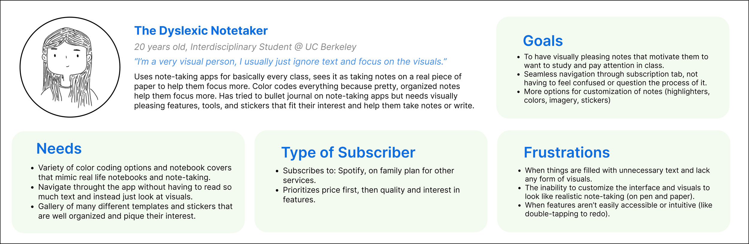 From our interviews, we segmented the user base into 3 different personas with their own needs, subscription habits and note-taking goals. They are The Aesthetic Notetaker, The Practice Notetaker, and The Dyslexic Notetaker.
